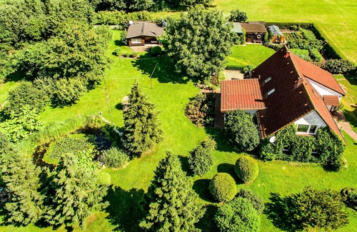 The two separate accommodations, the house and the apartment, located on a 2500 m² closed private land with a safe parking for cars and bicycle shelter at the far edge of the village in a quiet location on the island of Rügen. The park-like property offers next to the fish pond, barbecue and Räucherplatz also plenty of space for relaxing and undisturbed sunbathing (also still available). Bikes and BBQ can be rented for a fee.