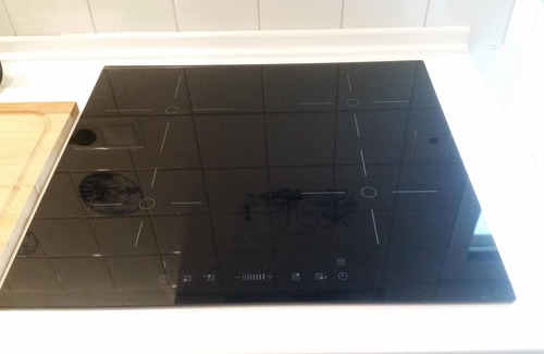 Kitchen fully equipped with induction stove, fridge with 3 star tray, coffee maker, toaster and kettle