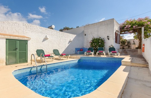 This traditional menorquin villa is 800m from the sandy beach of caln porter. It is ideal for families and close to all bars and restaurants and shops. It provides you with a private pool area, with great views of the surrounding areas. Also a barbecue area and covered terrace for you to enjoy outside dining amongst the gardens. It has 3 bedrooms with air con and has a spacious lounge area with satelite tv, dvd and wifi included. and fully equipped kitchen. It is only 1.1km from the cova den xoroi.