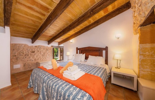 The rustic holiday home Sa Buhardilla Petita is part of the agroturismo SES CASES D'ES RAFALET and is near the village Manacor in the east of Mallorca. The beautiful, rural villa consists of a living room, a well-equipped kitchen, 3 bedrooms as well as 2 bathrooms (1 ensuite) and can therefore accommodate 6 people (4 adults; 2 children under 12). Additional amenities include Wi-Fi, air conditioning, fans and a washing machine. A baby bed and a highchair are available upon request. The large property features a shared garden with seating furniture as well as a communal pool where guests can cool off or just relax on the sun loungers with a refreshing drink. There is a small pool with a slide for children, as well as a small playground and table tennis. There is also both a covered and an open terrace where guests can enjoy the fresh air and beautiful mountain views, or cook a delicious meal outside on the shared grill. Despite the peaceful location of the finca, all the essentials are just a short drive away - a selection of shops and restaurants can be found less than 10 minutes away by car in Manacor (approx. 5 km). Many beautiful sandy beaches are also just a short drive away, such as the stunning Platja de Porto Cristo, just 23 minutes away by car (18.2 km). Palma de Mallorca and the international airport are a 43-minute drive away (51.1 km).