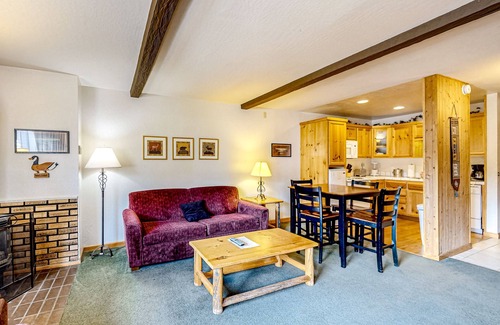 Overlooking woodlands, your one-bedroom with loft townhome boasts vaulted ceilings, a gas-burning fireplace, and a modern, open layout. The full kitchen is well-equipped for prepping your favorite recipes, and there’s plenty of space to gather for mealtime, board games, and puzzles between the living and dining areas. Step out on the balcony for a breath of fresh mountain air anytime.