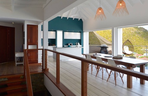 Located only a few steps away from the fantastic Flamands Beach, the charming rental villa Flamands Bay in St. Barths offers a splendid view over the sparkling ocean, the beach and the surrounding islands. Built on two levels and decorated in a contemporary style, this luxurious vacation house is one of the best choices for couples looking for a romantic stay or for a honeymoon in St-Barths.