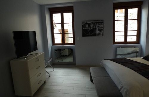 A double bed 160 cm (linens provided), a bearing, a dresser, a luggage rack, a flat screen TV and two armchairs.