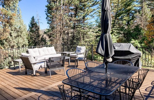 The home is filled with tall windows for gorgeous lighting and views. The outdoor balcony is the perfect place to enjoy a meal in the fresh mountain air.