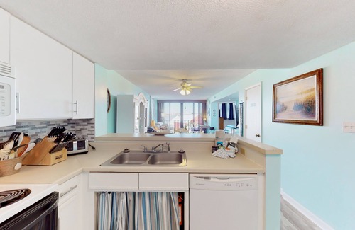This fourth-floor side condo is full of the comforts of home. Leave the day's swimsuits and beach towels in the private washer/dryer while you cook homemade meals in the well-appointed kitchen. Dine at the breakfast bar or the adjacent table, then kick back and relax while watching shows on the 65-inch smart TV in the living room. The primary bedroom has a TV and an en suite bathroom, while the guest room has access to the full bathroom in the hallway. A desk workstation is ideal for remote work or online school.