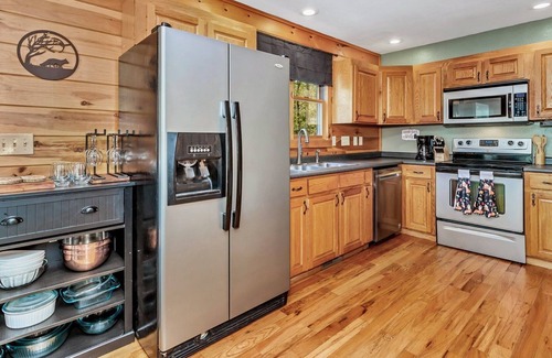 Interior Features Include: Rustic, log cabin with lake views. Beautifully stained wood table seats 6 - 7 guests. Additional seating can be found in the living room, game room, and on the wrap-around covered deck. Full kitchen equipped with all essentials, stainless appliances and drip coffee maker. 3 TV’s in the home. Towels, Linens, and Starter Package of soap etc. are included.