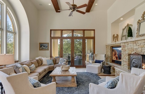 Just a short drive from downtown Austin, the ABOVE Villa Bonita Estate offers your own private oasis with an elegant Spanish flair. The private backyard is like having your own slice of the Texas Hill Country. Enjoy the pool and hot tub in this private setting or play ping pong poolside. Grill on the patio and dine by the patio fireplace or lounge while watching the game. Inside, a walk-through bar is the perfect spot for a welcoming margarita bar. With an open floor plan and floor to ceiling windows in the spacious dining, kitchen and living areas, you can relax, visit, and enjoy those private views. Enjoy the media room upstairs as you watch a movie with your friends and family. There is exercise equipment you are welcome to use as well as a desk should you need to get a little work done during your visit.