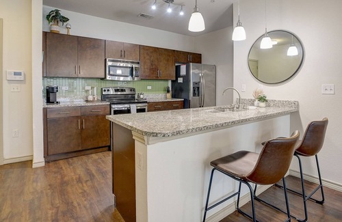 Our six-bedroom, six-bath apartment is furnished with six queen beds and everything you & your guests need to enjoy your stay in Austin! 5 of the bedrooms have ensuite bathrooms and the sixth bathroom is in the hallway. In the kitchen, you'll find beautiful appliances, a Keurig coffee maker, and basic cookware to cook simple meals for a cozy night in! There's free WiFi! There is also a washer and dryer in the apartment for your convenience. This suite also features a private theater room with an HD projector and 110" screen.