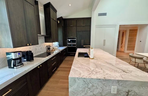 The home boasts two luxuriously appointed en-suite master bedrooms on the first floor, each featuring spacious walk-in closets and elegant bathrooms with indulgent wet room showers and soaking tubs. A third en-suite bedroom upstairs offers a cozy retreat with a king-size bed and a charming sitting area, perfect for a morning coffee or evening read. A full bathroom completes this serene bedroom, making it ideal for guests seeking privacy and comfort.