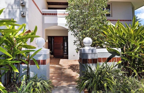 -Palm tree landscaping leading to a stucco, inviting, front entrance.