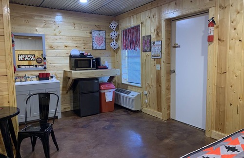 The Gambling Buffalo Cabin at The Lazy Buffalo has two queen size beds and a full bathroom with a large walk in tiled shower accented with glass blocks. Knotty pine and corrugated tin are used throughout the spacious cabin. Dark stained concrete floors and tin ceilings really add a rustic yet elegant touch. The kitchenette area has a mini fridge, microwave, k cup coffee maker, along with table and chairs.