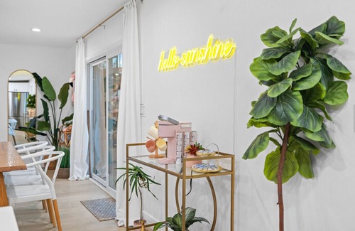 The spacious dining area is a showstopper, with a beautiful wooden table that seats up to 10 guests—ideal for family meals or celebrations. A disco ball chandelier adds a fun, retro touch, while the "hello sunshine" neon sign and natural light streaming in from the sliding glass doors create an airy, welcoming atmosphere. Whether enjoying a homemade meal or a takeout feast, this space is designed for memorable dining experiences.