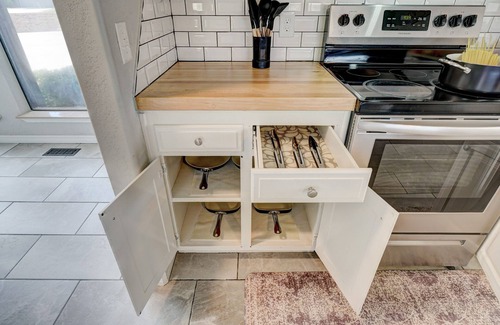 Custom built chef’s kitchen with stainless steel appliances and butcher-block countertops. Drawers are fully equipped with kitchen gadgets and utensils for guests to cook and serve up the most delicious meals! The kitchen bar seats two comfortably in addition to the dining room (seats up to 6). Other appliances provided include: hot water kettle, air fryer.