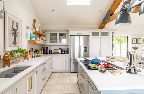 The open-plan living space enjoys double doors at the back, which open out onto a bridge over the ground floor light well, and lead you to the large entertaining terrace. Here, there is an outdoor dining table for eight guests, a sofa and armchair with a coffee table, and sun loungers. From terrace, guests can enjoy use of the outdoor cooking area, with both gas and charcoal barbecues, a pizza oven and a fire pit. The terrace is surrounded by flowers, and the lawned garden behind leads you onto the woodland paths where you can take a stroll and enjoy a picnic.