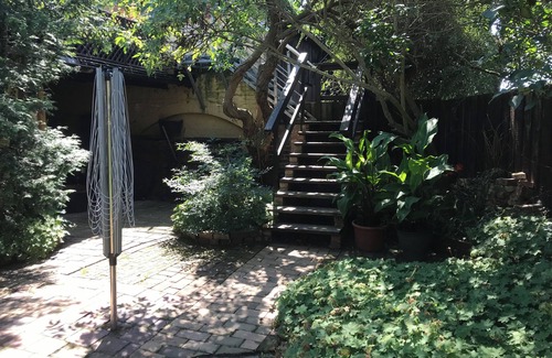The courtyard "behind the gate", which is visually completely closed to the outside, is also intensively greened vertically. Grasses can even grow in the pavement joints, provided they remain low. The rather shady and moist biotope with some sun islands is particularly "tolerable" on hot summer days.