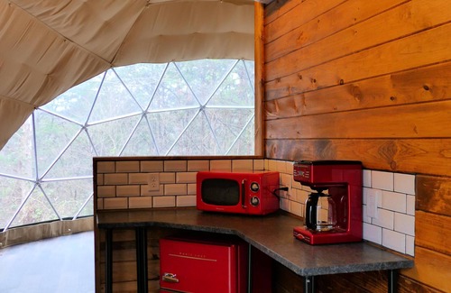 Our geodomes are the first in the United States to feature indoor plumbing, HVAC, and electricity! The style blends contemporary with comfort, featuring exposed metal piping, butcher block shelving, and pebble shower floors in the custom bathroom. You'll find a king-size bed, a table for two, and a cozy seating area facing the expansive picture window. The kitchenette, equipped with retro-style appliances, completes the space. These geodomes are blissfully free of televisions, allowing you to unwind fully in nature's tranquility. From the window, enjoy sweeping views of the lush forest, where the changing seasons transform the landscape—vibrant green in spring and summer, brilliant hues in fall, and a serene winter wonderland when snow falls. The peaceful ambiance of the woods invites you to relax and unwind, bringing the beauty of nature right into your geodome.