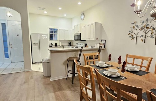 This amazing vacation home boasts an open floor plan, offering a wonderful social feel for your family vacation. Head to the kitchen where you will find a fully stocked kitchen that offers everything you need to cook a meal for your family. The large dining table offers seating for 8 plus 2 more bar stools at the breakfast bar.