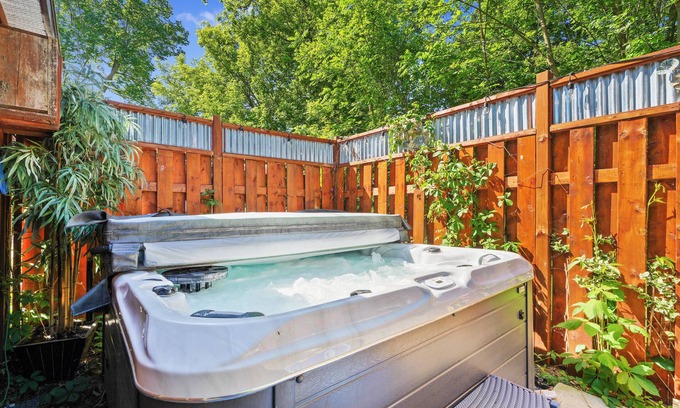 Primary Bedroom: Queen bed, full ensuite bathroom, private entrance to the hot tub.