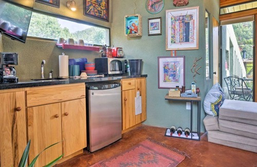 Discover all that the Santa Fe area has to offer and stay at this 1-bathroom vacation rental studio in Glorieta. The unit is nestled on 11 acres of beautiful land that’s rich in history as the Civil War of Glorieta Pass was fought on the property and has an Amtrak train that runs across. Inside, the studio features a wall of windows, natural light, a wood-burning fireplace, and colorful art. Spend the day at Ski Santa Fe, experience a river expedition, or drive into Santa Fe, just 20 miles away.