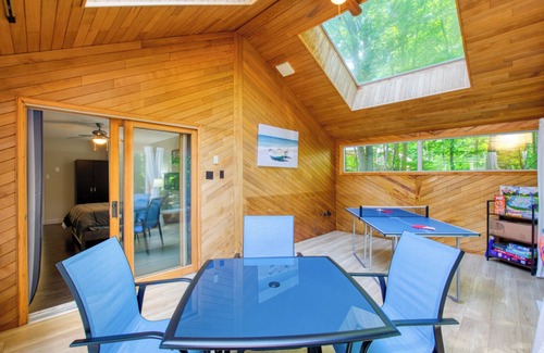 Large sunroom turned game and hangout room includes a ping pong table, and table for board games. The sunroom boasts abundant daylight and scenic views of the backyard greenery, with sliding doors leading straight onto the outdoor deck or master suite.