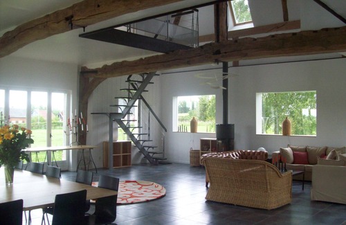 a large living room with cathedral 100m2 Swedish wood stove, kitchen 21m2 fully equipped with 5 burner range cooker, dishwasher, microwave, etc a large hallway with two additional bathrooms, 6 bedrooms, two with en shower and toilet, the other 4 rooms situated on the mezzanine above the large living room have a comfortable bathroom with bath, shower and double sink.