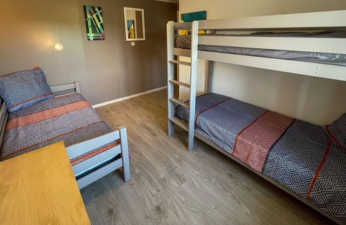 On the night side, you'll find an adult bedroom with a 140x190 double bed and a bedroom with 3 single beds including 1 bunk bed.