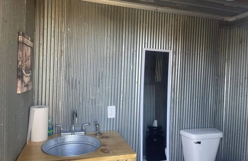 For restroom facilities, an outhouse with a flush toilet and sink is available, ensuring your comfort during your stay. PLEASE NOTE there's no shower on the premises. Restroom facilities are shared with one other glamping cabin (The Mountain) on the property. THERE IS CURRENTLY NO ELECTRICITY AT THE 2 GLAMPER CABINS.