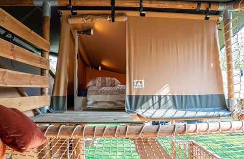 The atmosphere during a holiday in a Glamping Tent is truly unique. It's like camping in a holiday home. You have a nice living room with a seating area, a kitchen with, among other things, a gas stove and refrigerator and a nice bathroom with shower and toilet. There are four bedrooms in total, one of which is on the first floor. This spacious Glamping Tent is located on the edge of the campsite with a view of lake De Rhederlaag. From the beautiful terrace with garden furniture and the lounge just on the first floor, you can enjoy the peace and quiet here. Nearby are some pieces of playground equipment. Ideal for the children. At this holiday park you can book various accommodations for different numbers of people, with and without wellness.