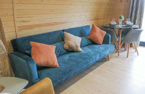 Shower Room: Walk-In Shower, Heated Towel Rail, Toilet. Gas central heating, electricity, bed linen, towels and Wi-Fi included. Welcome pack. . Hot tub for 5 (private). Private parking for 2 cars. No smoking.. This two bedroomed pod offers an open living area as you enter with small dining table, kitchenette, and sofa for watching TV at the end of a long day. The T shape design provides a bedroom to each side offering privacy, ideal for two couples, or families with children. One is configured as a kingsize and the other as a twin which can by changed to a super kingsize upon request. The shower room has a walk-in shower, heated towel rail, toilet and basin.