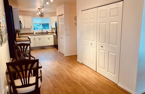 Take it easy at this unique and tranquil getaway. Nesika beach bluff house overlooks the ocean with spectacular views, you can see the light from the lighthouse in Port Orford. It is a short walk to the beach where you can walk for miles. Just six short miles north of gold beach with lots of hiking trails nearby. Well behaved and potty-trained dogs and cats allowed. Dog friendly with a fenced yard. There are 2 bedrooms each with a king size bed and 2 full bathrooms. There is a porch in back. A fire pit and a large private green yard.