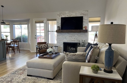 This home includes 3 Bedrooms, a Loft/Office and 2 1/2 baths. The Master has a king bed and is on the 1st floor. Adjacent is a Master Bath with separate shower and bath tub, and a walk-in closet. The 2nd floor includes 2 bedrooms, both have queen beds, a dresser and closet; there is also a Loft/Office space with queen size Sofa/Bed, desk area for two, 65" LG Smart TV and large ottoman. The 2nd floor bathroom has a shower/tub combination and two sinks. The 1st floor includes a Guest Bathroom, Dry Bar, Family Room with wood burning Fireplace and 55' LG Smart TV, Kitchen and Breakfast Nook with view of the Golf Course and Foothills. The first floor also includes Dining Room with table for six people, small Living Room Sitting area with upholstered chairs (2) and bench (1). Laundry Room and 2 car Garage have inside entry. All Furnishings and Fixtures are new since Sept. 2022. The backyard has patio areas for the BBQ, which has a tiled table top, seating and refrigeration and the Fireplace, which has tiered walls, seating and uses a propane tank. The center raised Patio has a Chimenea and Wicker cushioned lounging chairs and a table. There is a small gate on to the golf course for a morning walk on the cart path.