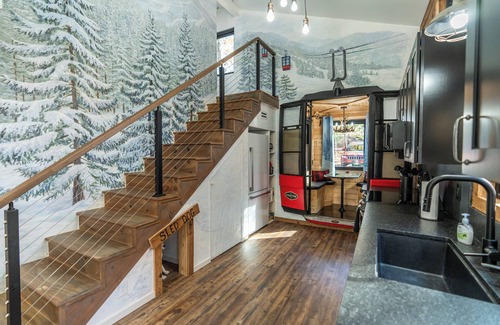 The most Unique cabin in the Poconos is right out of a Skiers Dream...stay in a real Gondola from Stratton VT! Located in Lake Harmony, our tiny cabin offers a one-of-a-kind experience! The moment you walk in, you will feel like you've arrived right on the mountain side with a stunning mural spanning the entire length of the cabin. Prep a meal in the fully stocked kitchen, relax and watch TV on the oversized sofa or eat and drink in a REAL Gondola shipped from VT. The first floor Bedroom has a Queen bed, washer/ dryer and feel of an old Camp. The large, rustic bathroom is located on the first floor and is right out of a magazine. Upstairs there are two XL bunk beds with individual TVS and complimentary ear buds. If inside isn't cool enough, enjoy a campfire, the hot tub or complimentary beach passes in season!