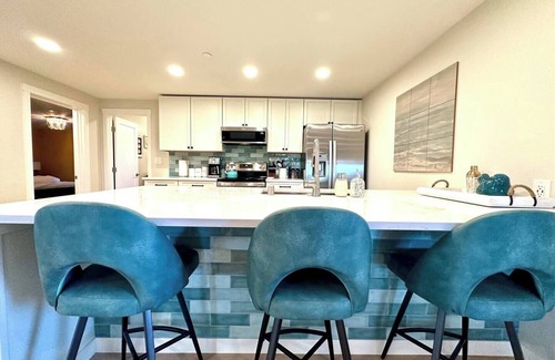**KITCHEN:** Calling all culinary enthusiasts! The fully equipped kitchen is a dream come true, featuring stainless steel appliances, a cozy wet bar with seating, a coffee maker, blender, kettle, slow cooker, dishware, flatware, an ice maker, a toaster, and an array of spices. Everything you need is at your fingertips to create memorable meals with your loved ones.