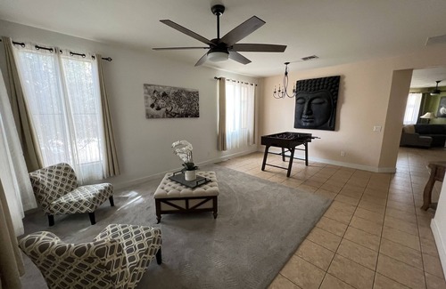 Fabulous single story house in Goodyear with 4 bedrooms 2 bathrooms (2200SF). Friendly, very clean, quiet, comfortable. Cook with gas (charcoal grill). Internet/Wifi (80 mbps), Netflix, Hulu, Disney Plus, ESPN. Master bath has separate shower and large tub and two sinks. Guest bath has tub/shower combo and two sinks. Close to shopping areas, walking distance to a Super target/Fry's/Ross and other shops. Close to mountain trails for running, hiking, biking or horse riding. Close to baseball stadiums for training camps, football and hockey. Many golf courses nearby.