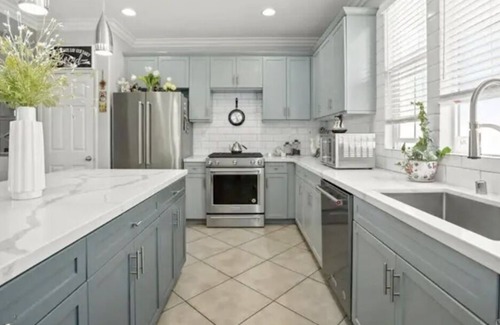 Each of the three bedrooms has its own en-suite bath with custom quarts countertops. One bedroom suite is located on the first floor including desk for any remote work you may want to do. The second two bedrooms are located on the third floor. The master bedroom features a king size bed with soft cotton sheets and plenty of pillows. The Master bath comes with dual vanity and large walk in closet.