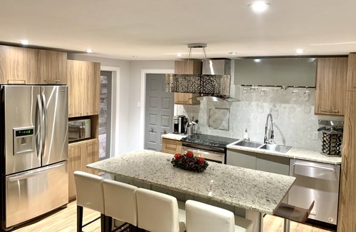 Zen1 Apartment on lower floor: Bedroom with 2 Queen beds and single bed that can accommodate up to 5 people comfortably. Living area with ambiance/heating fireplace and plasma TV with internet services (Netflix, Bell Fibe TV, Youtube). Full bathroom with double sinks, bathtub and shower, equipped with washer and dryer.