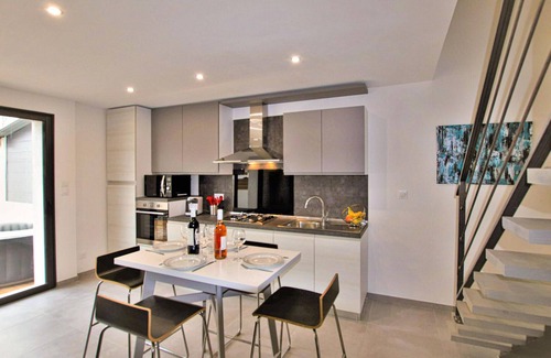 The apartment is contemporary and offers a refined and very modern interior with a beautiful American kitchen. The two comfortable bedrooms each have their own shower rooms. The small, enclosed garden has a pleasant, private swimming pool bordered by a pretty, sunny wooden terrace.