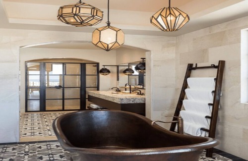 The Grand Solmar The Residences 4 Bedroom Penthouse is a stunning 9,000 square foot (more than 5,000 square feet under air conditioning, the balance is terraces, patios and pool area), 4 bedroom, 5.5 bathroom luxurious residence. Two master retreats have a king-sized bed that is appointed in vibrant, crisp linens that correspond beautifully with the Baja landscape. The ensuite bathroom features marble floors and vanities. The jacuzzi tub is the perfect spot to relax after a day at the beach!