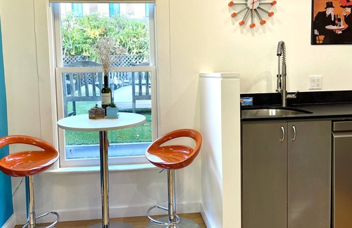 Enjoy the entire private 1,400-sq-ft, two-level cottage with large windows, hardwood floors and private sun deck.