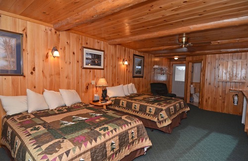 Grand Pines Motel includes ten motel rooms, located on Little Round Lake near Hayward, Wisconsin. These newly-remodeled motel rooms are the perfect lodging for everything from romantic getaways to outdoor escapes. Each of our comfortable, Northwood’s inspired rooms include two queen beds, a flat screen TV, a small refrigerator, microwave, a wet sink, a coffee maker, private deck off back, central air and whirlpool jets in the tub. Amenities
