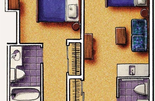 With approximately 600 square feet of living space, two-room kitchenettes feature a king bed in the master bedroom, a queen bed, a comfortable sleeper sofa, two full bathrooms and a well-equipped kitchenette. The kitchenette affords you the comforts of home with a mini-refrigerator, microwave oven, two-burner stove and even a mini-dishwasher.
