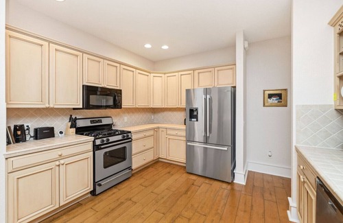 A fully stocked kitchen with stainless steel appliances and a Keurig coffee maker.