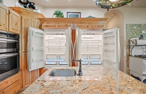 The beautiful kitchen comes with granite countertops and granite bar top with rosewood seating. It is equipped with both a gas stove and and electric stove top . Two ovens for baking . Two dishwashers, two microwaves , two side by side refrigerators. Small appliances such as crock pots (2),an air fryer, pancake griddle and a couple of hand mixers.