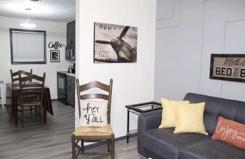 Just Enough for 4 that it is! This property gives tribute to all our military with an AIRPLANE theme. Kitchen is well equipped with everything you will need for short or long stay, including some coffee to get you started in the morning. At night watch TV and enjoy the quiet nights at this little duplex. (there is a shared wall). Plenty of parking so if you are moving in any direction we have your U-Haul PARKING covered. Sit outside on the deck, table for 4 and enjoy a afternoon sweet tea or maybe an Arnold Palmer. Only 30 min from Hartsfield-Jackson Airport, if you are flying with a late arrival and driving south this is perfect place to stay. If you like to take a morning stroll you are just 1 mile to downtown McDonough where you will find a nice cup of coffee or maybe a nice adult beverage in the evening. 70 miles from the Robbins Airforce Base. If you don't like to stay in the BIG CITY but you want to visit THE ATL then McDonough, GA will be your smaller town vibe. This property is minutes off of HWY 75. There is a railroad close by and it does run at night and early mornings from time to time (we can provide a noise machine as well as ear plugs for the light sleepers). The location is a much older established neighborhood with maintained homes just not modernized. McDonough is a true southern vibe that you will not find just anywhere. Be prepared for a "Hey Y'all!