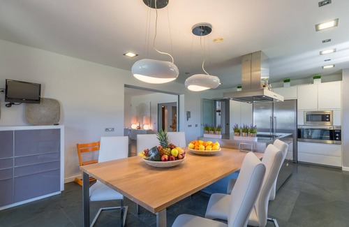 If you're looking for a unique experience in Mallorca, you can't miss visiting the impressive high-quality estate "Flor de Sal". With a capacity of up to 10 people, this villa has 5 double bedrooms, 3 bathrooms (2 of them en suite), air conditioning, heating, WiFi and many other amenities.Located just 5 km from the beautiful natural beach Es Trenc, this estate is situated on a large private plot with spectacular views of the island of Cabrera. The natural beach Es Trenc is one of the most popular beaches in Mallorca, with its crystal-clear turquoise waters and white sand. Although there is a good restaurant on the beach and some chiringuitos with live music, if you want a greater variety of restaurant options, cafes, and supermarkets, you should head to Sa Rapita or Colonia de Sant Jordi.The "Flor de Sal" estate boasts an impressive outdoor area, with a new XXL saltwater pool of 15 meters by 5 meters, outdoor shower, umbrellas, comfortable sun loungers, and chill-out furniture, surrounded by a beautiful garden. You can enjoy a ping-pong table to burn off some extra calories.Inside, the villa has 605 square meters of living space, professionally furnished and combined with exquisite materials. The ground floor is open and very spacious, with a luxuriously equipped designer kitchen, a huge living room with the highest level sofa area and satellite TV, and a large dining room overlooking the garden. All areas are integrated, but can be separated with practical sliding doors.Upstairs, you will find 4 additional double bedrooms, one of which is equipped with a private bathroom, while the others share a large bathroom with bathtub and shower. Each room is individually designed and accentuated with creative colors and elements. The house has air conditioning (cold/hot) and free Wi-Fi, as well as comfortable cots and high chairs for the little ones.The house's terrace is covered and furnished with a large dining table, where you can enjoy a delicious grilled meal on the modern gas grill or on the built-in barbecue at the back of the house. In short, "Flor de Sal" is the perfect choice for an unforgettable holiday in Mallorca, with a guarantee of well-being and many unforgettable moments that you will take home as memories. We look forward to your visit!Heating will calculated under consumption and will be charged separately (1,5€/L).