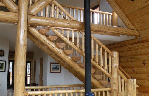 Loft: Open log staircase takes you to the 800 square foot loft with a King size bed framed in Aspen, two walk-in closets, double vanity, slate shower with bench, separate water closet, bunk bed, smart flat screen television and DVD player, small table for 2, and two separate balconies (one facing north and one facing south).