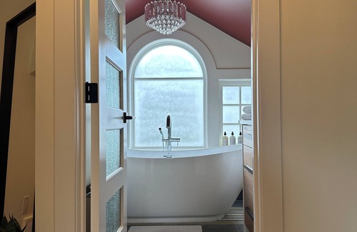 Passing through the double doors you enter the primary bedroom. There are his and her closets immediately upon entering and straight ahead is the king sized bed with a niche on either side for light and bedside storage. To the left is a third sitting area with a view of the river valley and to the right is the custom designed bathroom with funky tile, a stand alone tub and an assortment of complementary bath products.