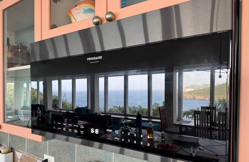 H2O Eco Villa is located in the gated community of Sprat Bay on beautiful Water Island in the USVI (the 4th official US Virgin Island since December 12, 1996!). Just a 10 minute ferry ride from Crown Bay Marina in St. Thomas (5 minute car ride from the St. Thomas airport), you can step into your Caribbean dream. Conceptualized and built by Haitian architect and artist, Sacha Thebaud, H2O Eco Villa prides itself on remaining 90% off the grid thanks to the 40 thousand gallon cistern beneath the house, Tesla power walls to store solar energy, independent septic, and an induction stovetop.