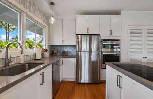 The contemporary and entertainer's kitchen with a center island seamlessly flows into the living area, bathed in natural light. Fully stocked for island-style culinary adventures (make sure to take advantage of the twice-weekly Hanalei farmer’s markets, and natural food store in the Hanalei village!), the kitchen leads to a covered lanai with a beautiful dining set, perfect for enjoying early morning meals or relaxed dinners with loved ones.