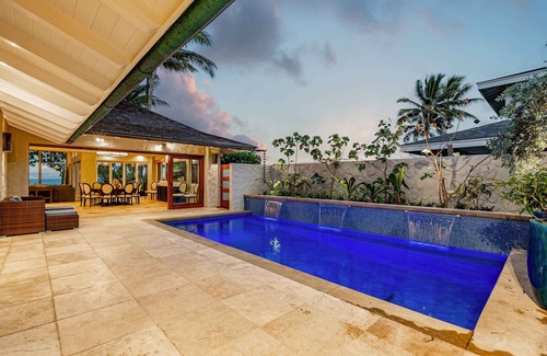 Discover true luxury and serenity at this spectacular oceanfront villa just steps from the white sand of Kailua Beach. Inside is a free-flowing open layout, a beautifully-designed gourmet kitchen, and six luxurious bedrooms, including a one-of-a-kind primary suite. Outside, discover a new favorite spot every day, with multiple lanais, a private pool, and a grassy lawn with cozy outdoor lounge areas, hammocks, and plenty of ocean views.